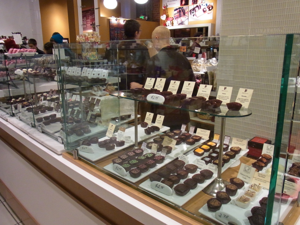 で、その前に、自分で味見!!と思って、以前、ダウンタウン探検中に発見した、チョコレート専門店のChocolate Boxに行ってきました。チョコレートは、お菓子の中で、一番好きなのです。コーヒーとチョコレートも、赤ワインとチョコレートも、うっとりします。