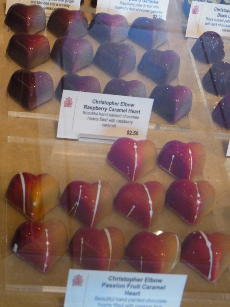 それから、私は購入せず、しかも、帰ってから知ったのですが、一部では全米一とも評されているらしい、Christopher Elbowのチョコレートも売っていたのです。写真のハートのチョコがそれ。ガラスが反射しちゃいましたが、美しさ、分かるでしょうか。次回はこれは試さなきゃ・・・。