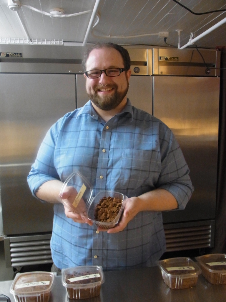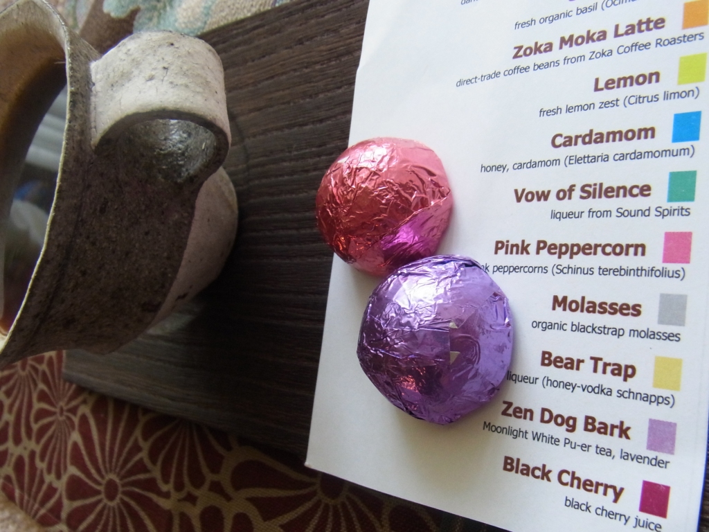 チョコレートの説明を聞きながら、テイスティングをさせてもらえるのでした。月替わりで、毎月、12種類のチョコレートを作っているそうです。それも、全て、アーロンさんが1人で手作りしているそうです。1つ$2とお高いのも、納得。