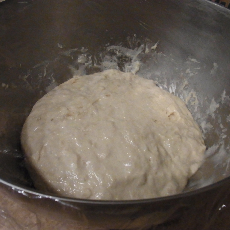 前生地に、小麦粉、イースト、塩、ぬるま湯をさらに投入して木のスプーンでまとめます。ちょっとゆるめですが、既にもちもちして、小麦粉の良い香りがします。