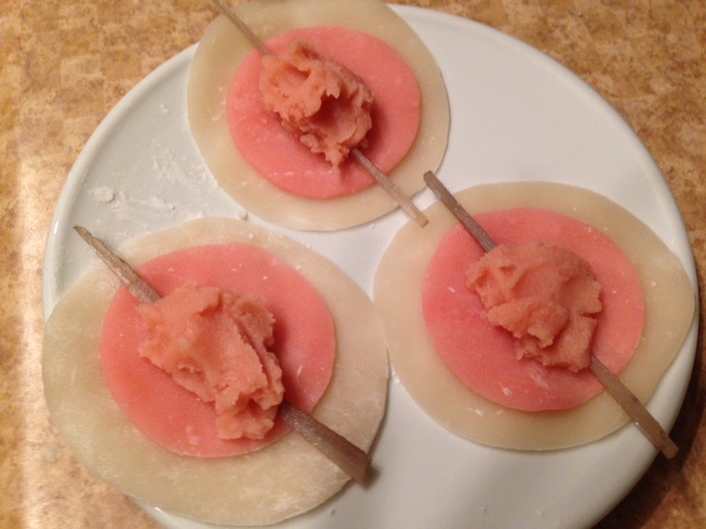 納得いかず、もう一度、挑戦しました。このときは、本に載っているバージョンを。味噌餡は、新年会で作った時の残りなので、ピンクのまま・・・。