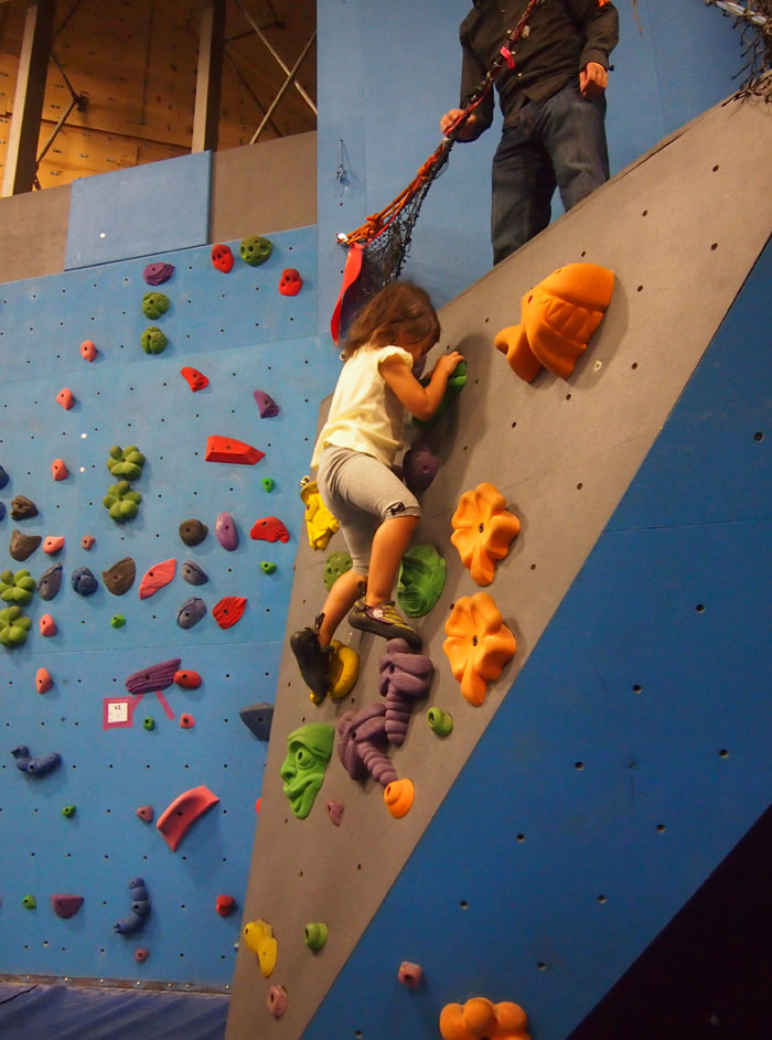 Stone Gardensというクライミングジムで、ボルダリング中の娘です。ここは、子供用のコーナーが充実しており、靴(娘のサイズは、アメリカサイズで9。8からあるみたいです)もレンタルできます。娘が大好きな義弟が連れて行ってくれました。1回目は、年上の子供達や初めての場所に怯んで、最初の30分くらい硬直していましたが、2回目の今日は、大はしゃぎでスイスイ登っていました。