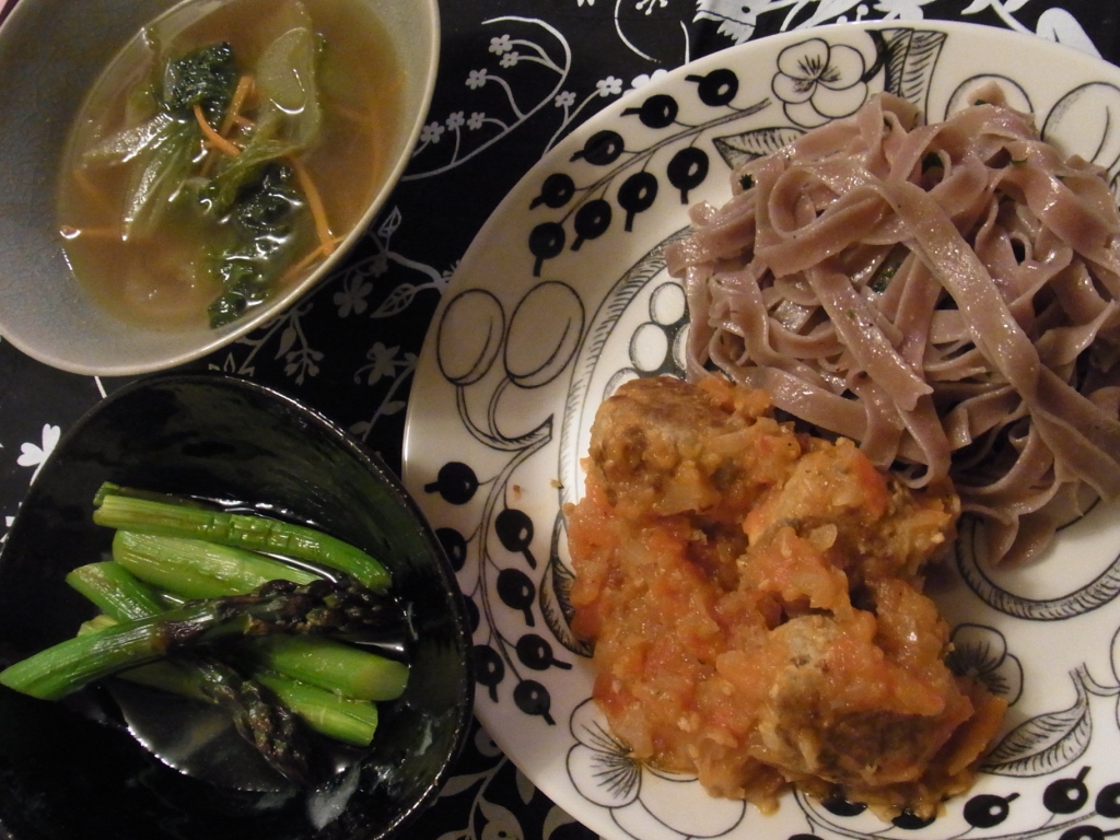 グリルしたアスパラの焼き浸しと、カベルネ・ソーヴィニョンのフェトチーネは、お薦め通り、オリーブオイルと塩・胡椒・パセリだけでの味付け。多少、ホントかなーと疑ってたので、一応、豆腐肉団子のトマトソース煮込みをつけました。