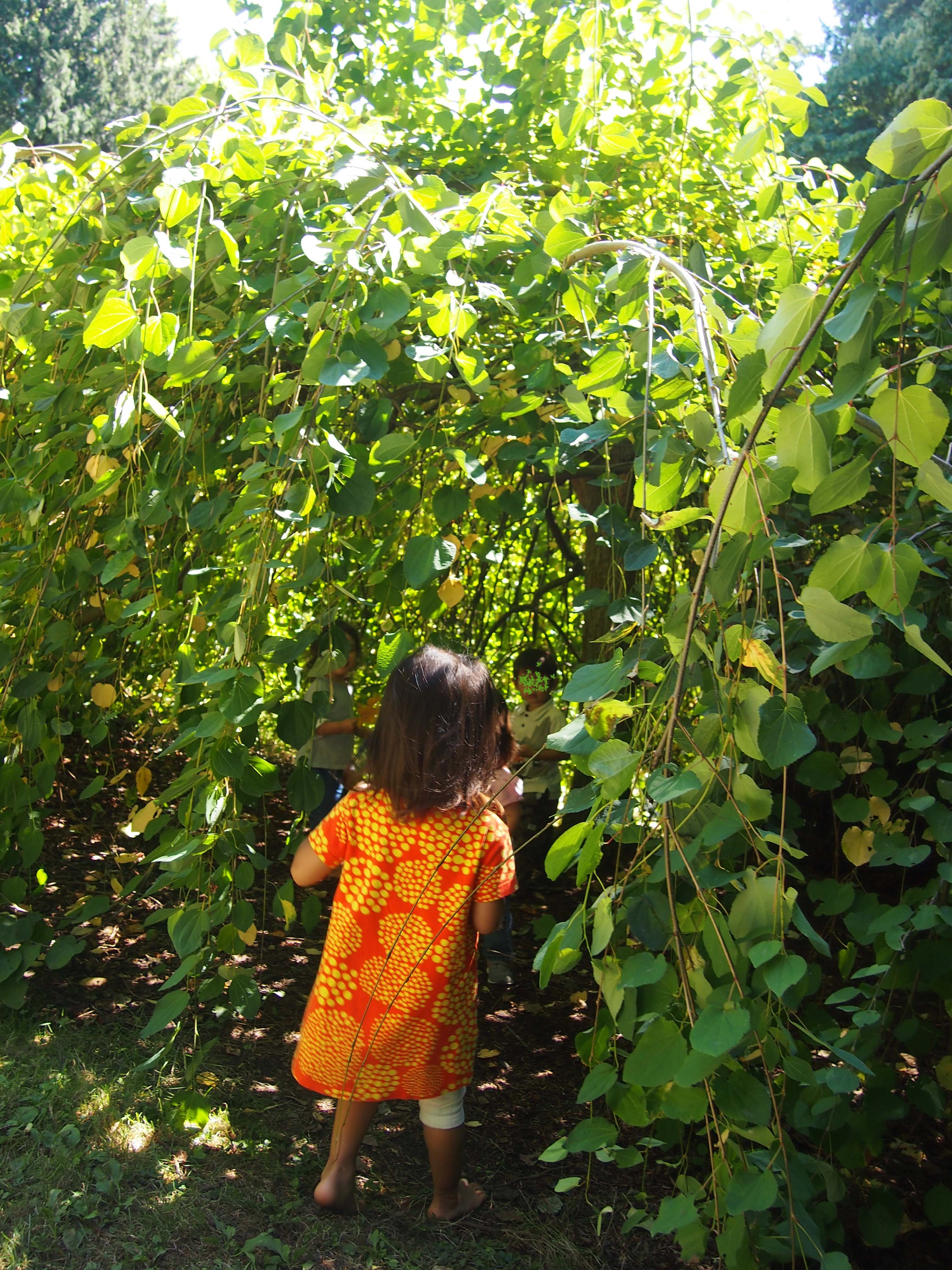 この写真は、森遊びでの一コマ。垂れ下がった木の枝のせいで、木のお家のようになってて、子供達が大はしゃぎで出たり入ったりしていました。