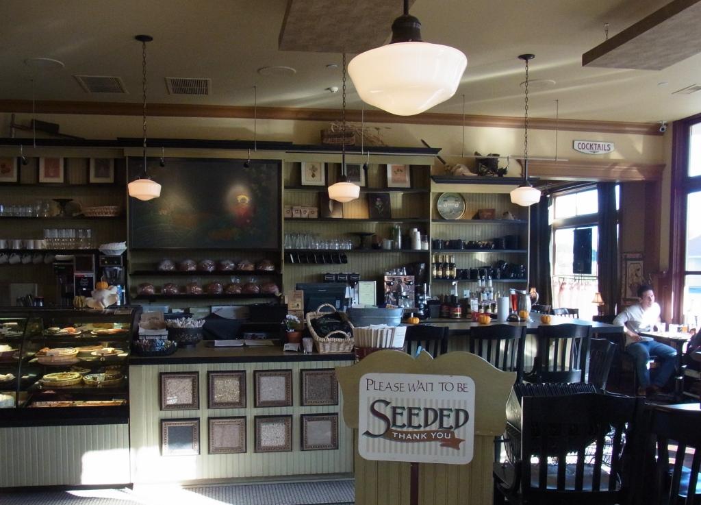 中に入ると、陽がさんさんと降り注ぐ、明るくて可愛らしい内装のお店です。入口すぐに、Please wait to be seated(お席に案内するまでお待ちください)の表示が、お店の名前とかけて、Please wait to be SEEDEDになってるのが面白い。