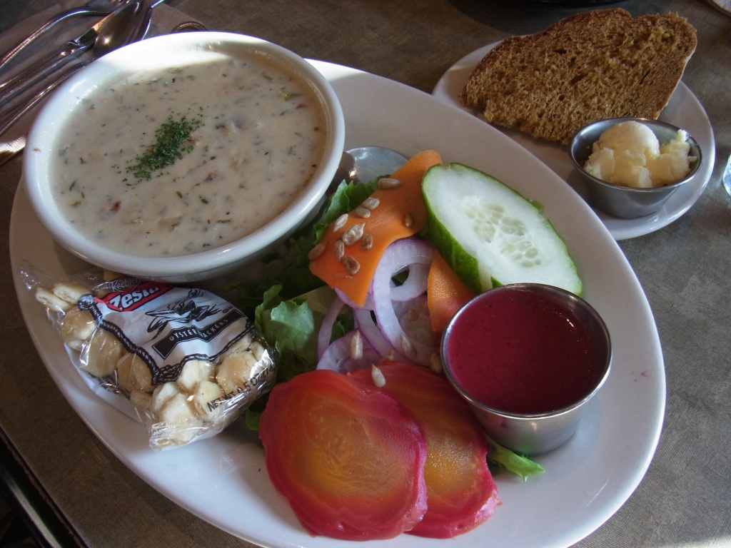 スープはクラムチャウダーを選んだのですが、ハーブが使われていて、今まで食べたことのない味わいが、美味しかったし、新鮮でした。パンは自家製パンらしいのですが、シナモン風味のほんのり甘味があるパン。野菜は新鮮で、ゴールデンビーツが美味しい!そして、アメリカのドレッシングって、結構しょっぱいことが多い気がするのですが、ここのドレッシングは、そうでもなくて良かったです。