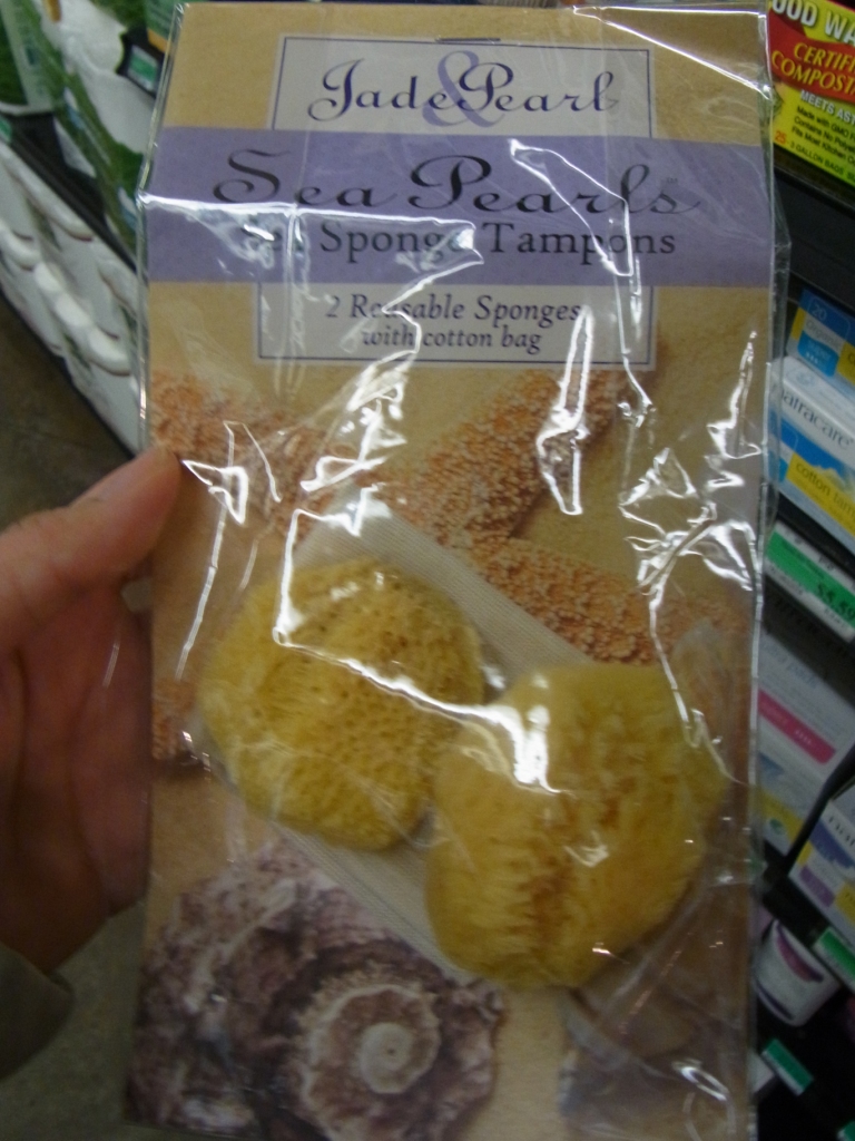 他にも、海綿タンポン(右の写真)、布ナプキンと布ライナーも、1種類のみですが、ちゃんと扱っていました。海綿は初めて見ました。色々考えるものですね。