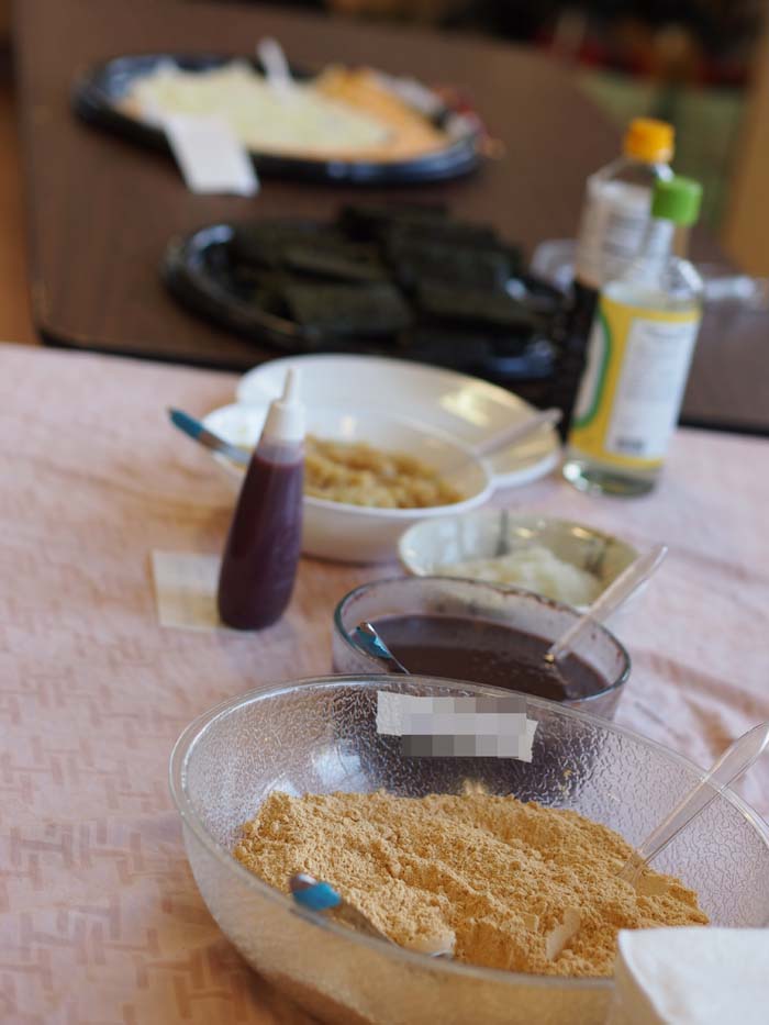参加者で分担して、色んなトッピングを用意。黄な粉、餡、練り梅、大根おろし、海苔、チーズなど。