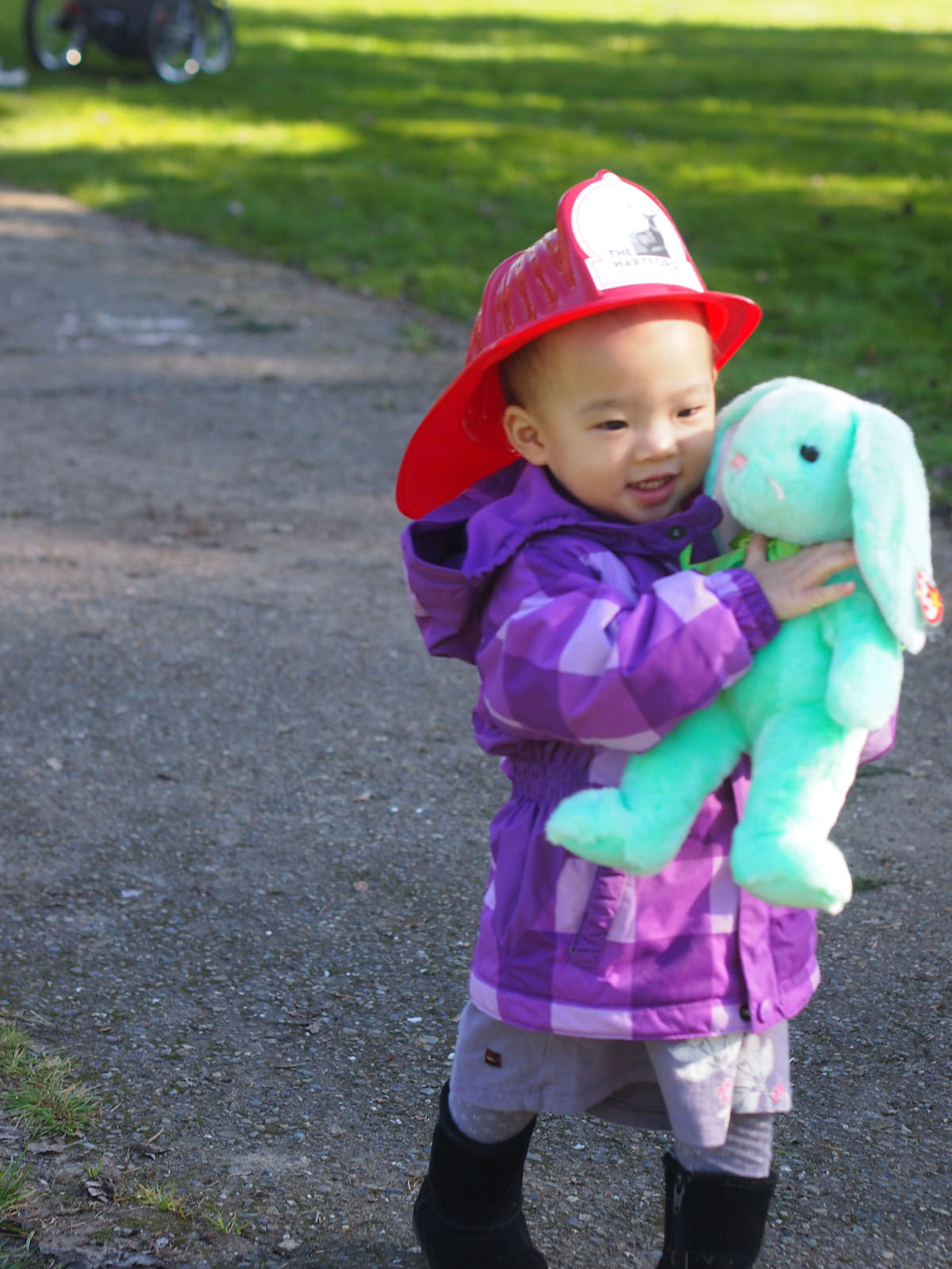 いくつ拾わせて、帰ろうとしたら、消防員の方が、何も持っていない娘に気づいて、「卵は拾えなかったの?」と聞いてくれました。残念ながら、と答えると、他のスタッフの方に何やら話して、ウサギの縫いぐるみと、プラスチックの消防士の帽子を渡してくださいました。