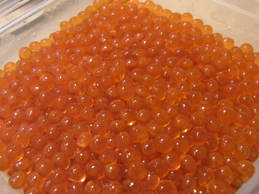 ピンクサーモンの卵よりも、色が鮮やかな気がします。写真は、味付けをしていない、ばらした直後のものです。