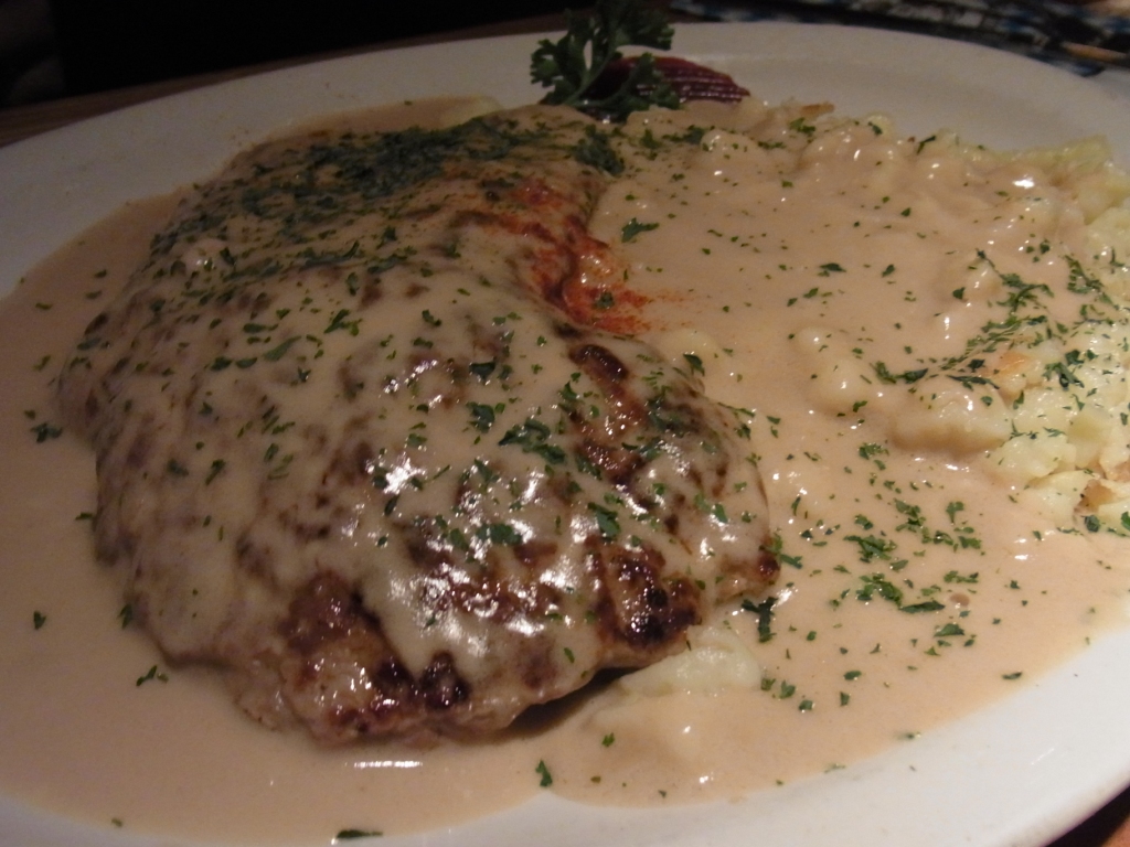そしてメインは、Edが、Sahne Schnitzel(シェ―ン シュニッツエル)という、クリームソースがかかったカツレツにSpaetzel(シュぺッツェレ)というニョッキのようなものが付け合わせについているもの、私が白ソーセージ(付け合わせがポテトサラダとザウワークラウト)にしました。