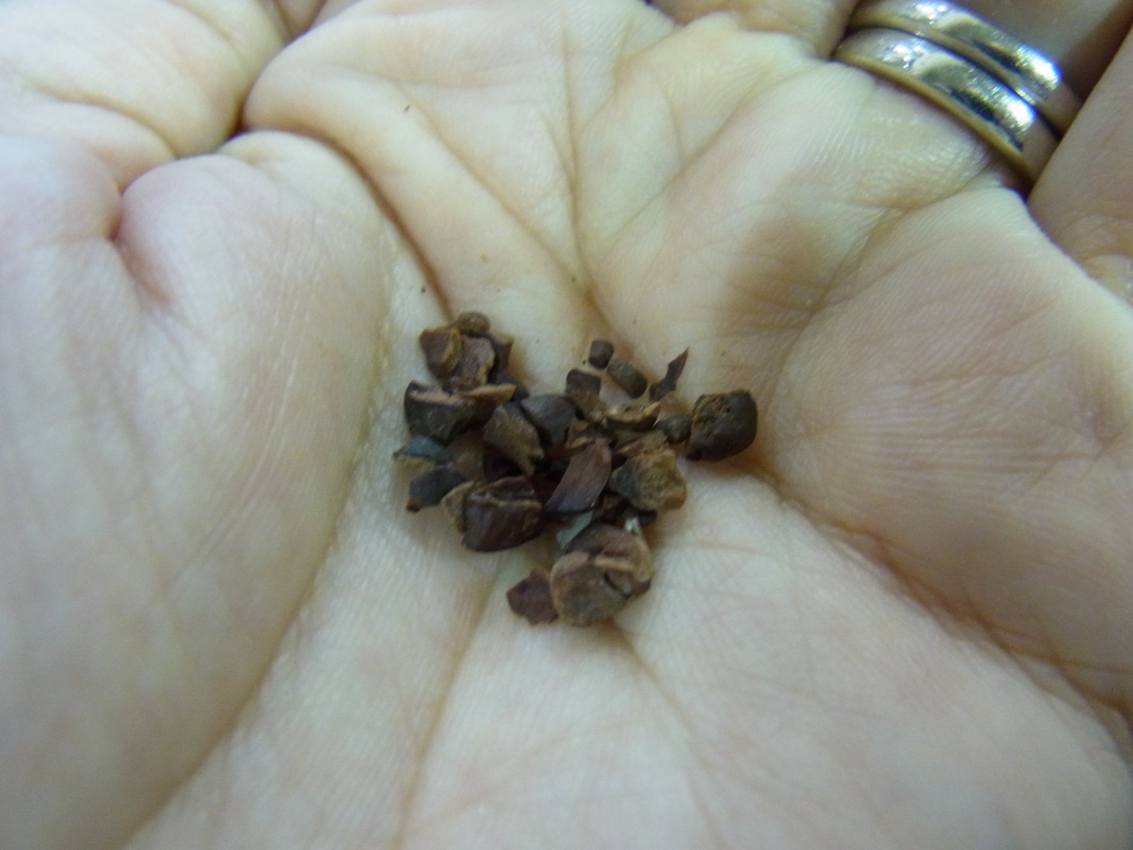 ←これが、カカオ豆の殻です。大きいです。この中に、白い実に包まれたカカオ豆がいくつも入っているそうです。