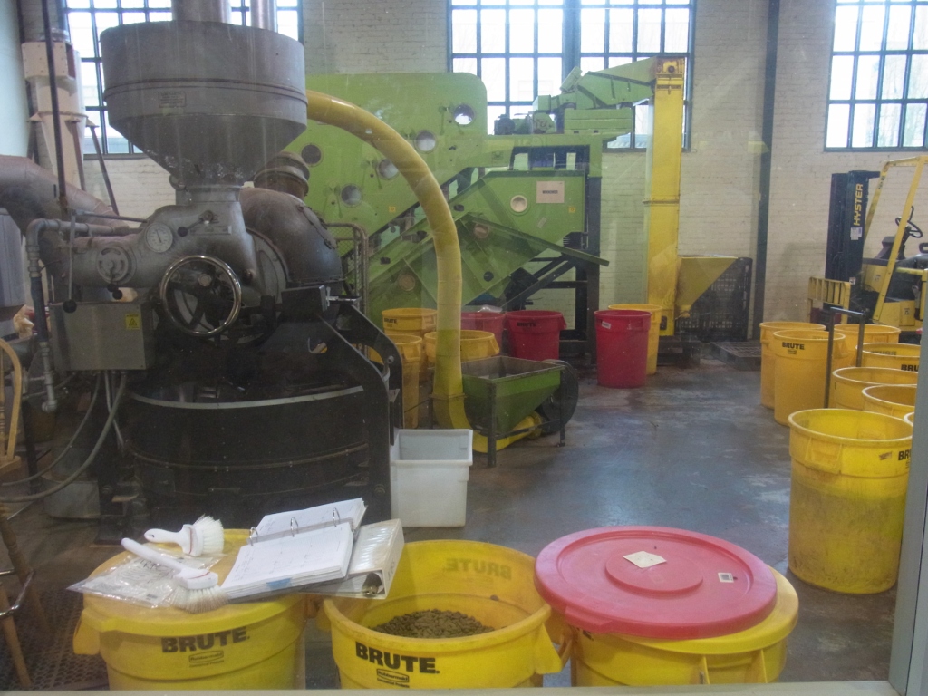 そして、工場は、至ってシンプルというか、ある意味殺風景とも言える景色でした。Theo自体が、2006年にオープンしたばかりの若い会社だそうで、置いてある機械も、ほとんどが中古品だというのも、面白いです。上の写真は、カカオ豆をローストする機械。1930年にドイツで作られたものだそうです。でも、見た目がレトロで、いい感じです。