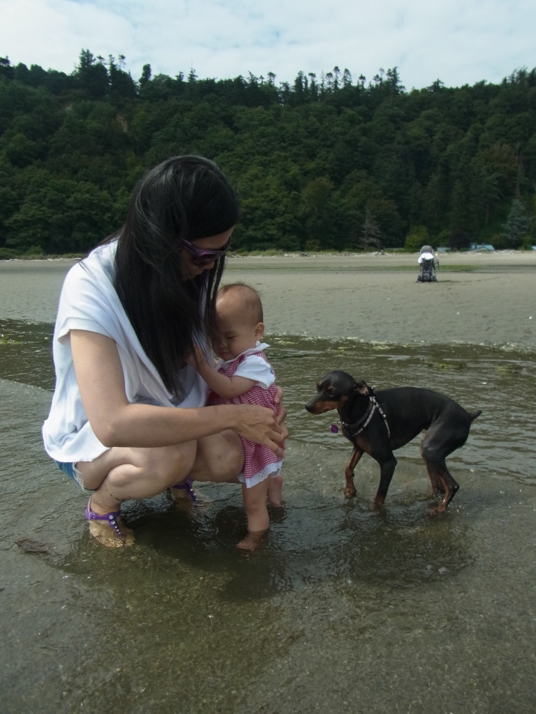 KOKOは、いつもは、海には近付いても、入ろうとはしないのですが、私もEdも娘も入っているのを見たら、置いてかないでえぇとばかりに、果敢に飛び込んできました(笑)そして、ヘッピリ腰ながらも、娘に、大丈夫だよーとでも言っているかのような態度です。大きい波が来た途端、逃げましたけどね。