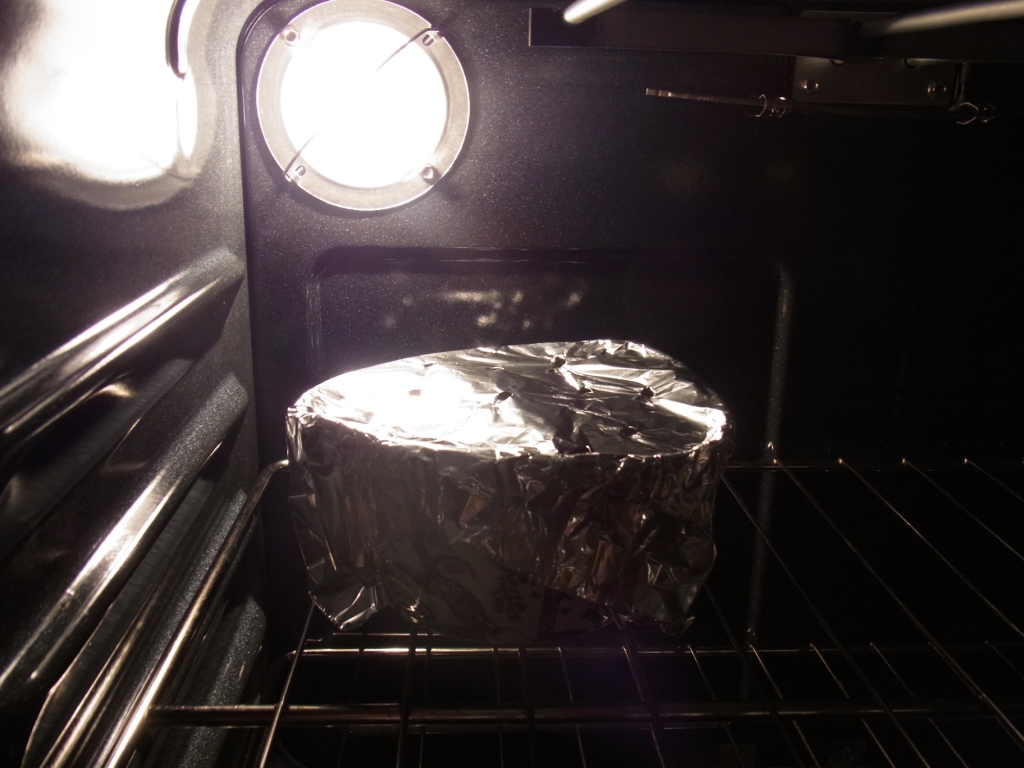 ②オーブン内のライトをつけます。このライトで温度が保たれるようです。納豆を入れた容器に、保温のためにアルミホイルを被せ、空気穴をいくつか開けて、ライトに近い部分に置きます。扉を閉めて、放置します。