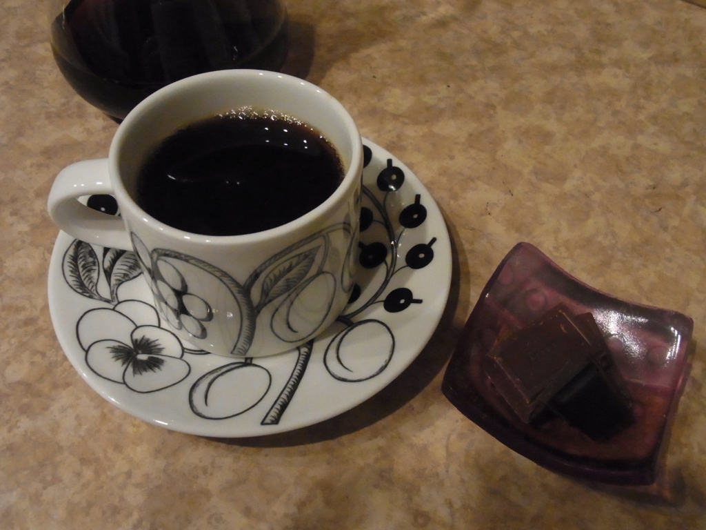 うちで一番高級なアラビア社のブラックパラティッシのカップで頂きます!お供には、くるみさんのガラス皿にチョコレート♪