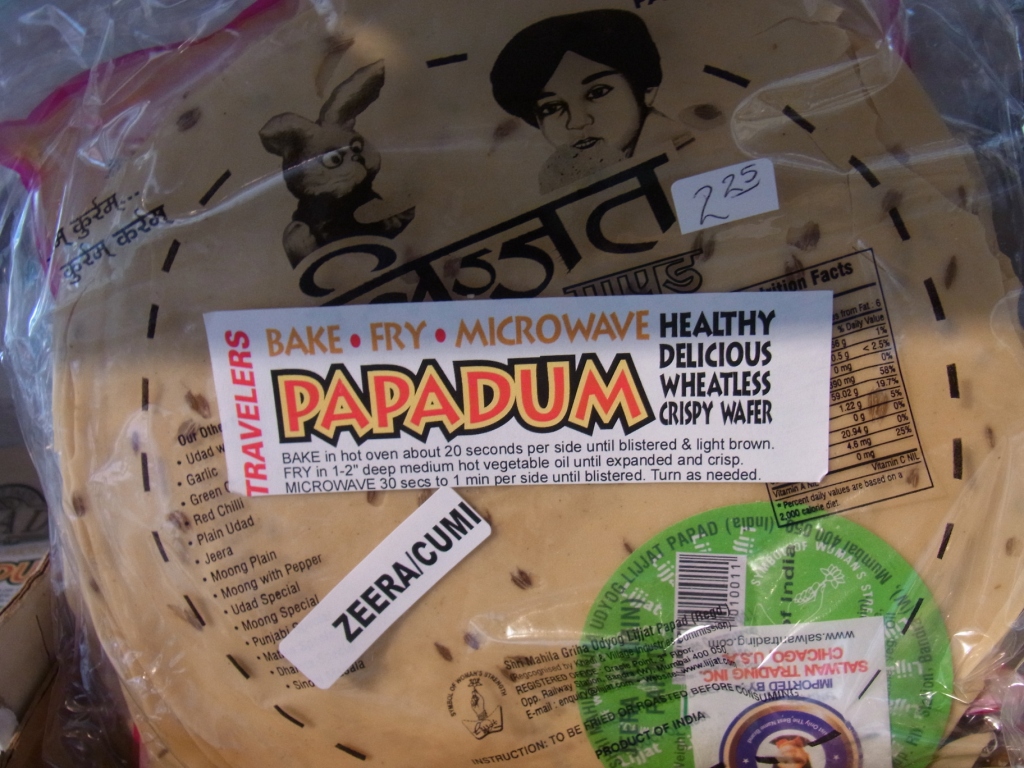 インドのお煎餅パパダムも、チリ味、クミン味、ノーマルとあります!$2.25です。日本のインド食材店で200円だったので、大体同じくらいですね。