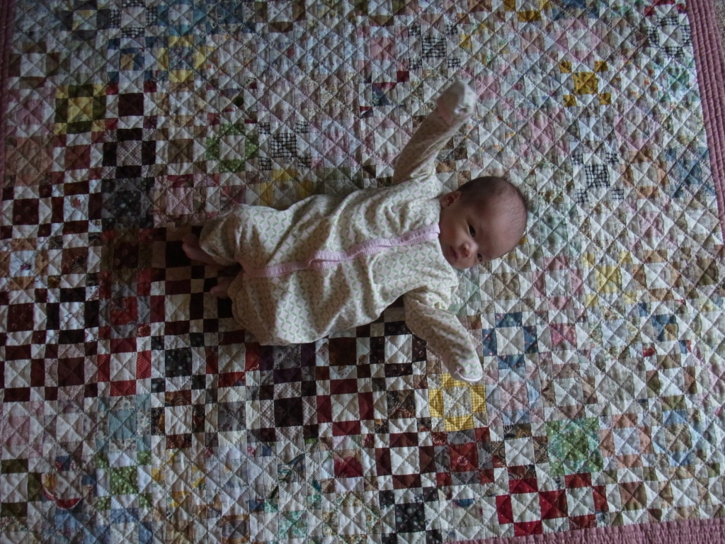 もう一つ、キルトの先生をしている叔母が、ベビーキルトを作ってくれたのも受け取りました。さすが叔母、私の好みを分かっているだけあって、微妙に地味な色遣いがツボでした。