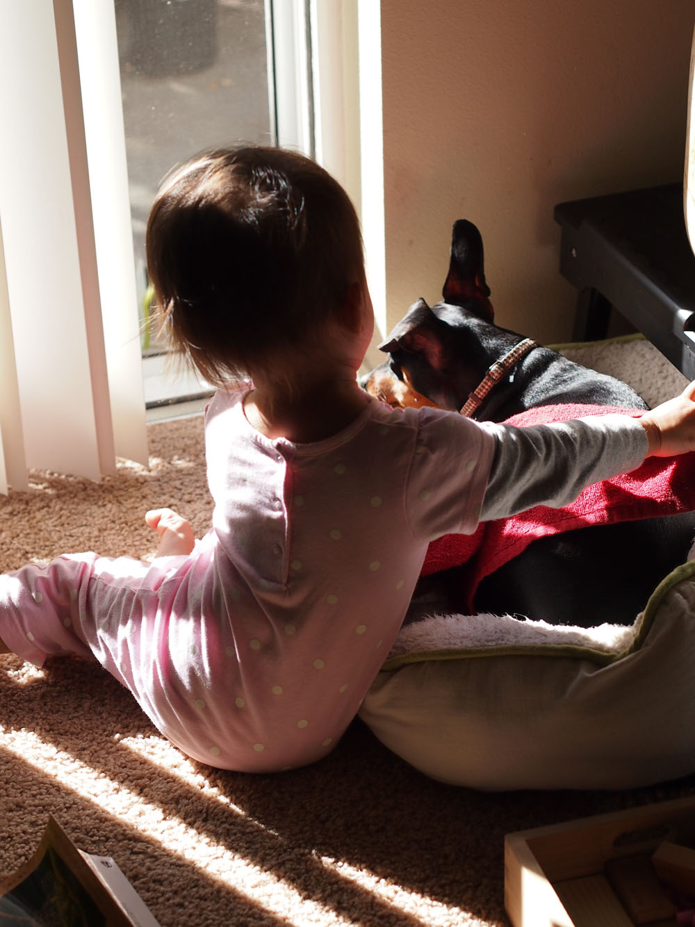 迷惑そうなKOKOに対して、娘は満足気に背中を撫でてあげている・・・。自分が寝かしつけの時にされてることをやってて、笑えます。