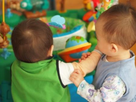 さて、プレイグループの中での娘ですが、この日は、お友達とオモチャを巡る攻防戦(笑)を繰り広げていました。