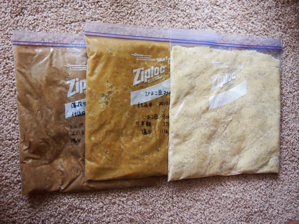 左の写真は、左側から、落花生味噌、ひよこ豆味噌、今回仕込んだ味噌です。落花生味噌とひよこ豆味噌は、できあがり直後の写真と比べると、色が濃くなっています。(見比べてみたい方は、過去記事をご覧ください~: