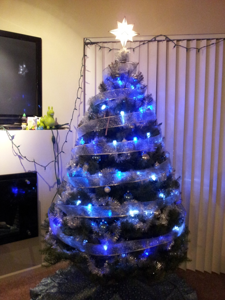 そんな訳で、樅の木の飾りつけは、Edがやってくれました。今年は、青・白・銀でまとめてもらいました♪青と白にチカチカ光るライトは大きいのしかなくて、ちょっとクラシカルな感じです。