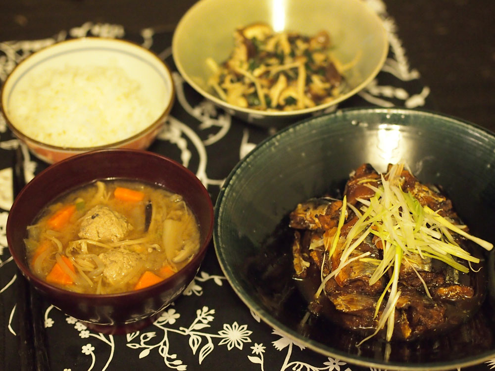 今回は、梅煮と具だくさんのつみれ汁。それから、同じく、H-Martだと安く手に入る、椎茸・しめじ・えのきを、頂いた紫蘇と合わせて、きのこのマリネ。お友達が、きのこのマリネの話をしていたので、夕飯のアイディアに頂きました。