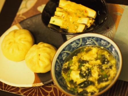 夕飯は、この肉まんに、中華風スープと、うーらさんのレシピで蒸しナスのバンバンジーソースがけを作りました。