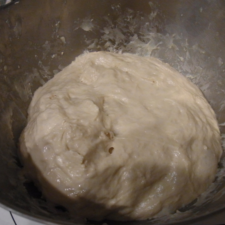 前生地に、小麦粉、イースト、塩、ぬるま湯をさらに投入して木のスプーンでまとめます。ちょっとゆるめですが、既にもちもちして、小麦粉の良い香りがします。