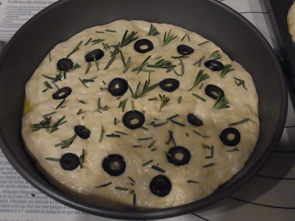 型全体に生地を広げていき、フォークで、ぶすぶす突いて、空気を抜きます。最後に、ローズマリーと、冷蔵庫に中途半端に余っていたオリーブも載せてみました。