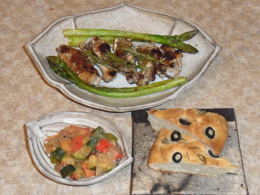 最近、忙しくて手抜き料理ばかりだったので、残ったローズマリーを使って、レモンハーブチキンのアスパラ添え、冷蔵庫の中途半端な野菜を使ったカポナ―タをつくって、フォカッチャと一緒に食べました~。結局、冷蔵庫の中を片付けるための料理だったのですが、Edは気づかなかったみたいで、感動してくれました(笑)