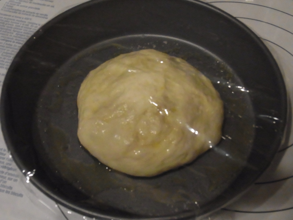 生地を二つに分けて、粉をはたいてまるめ、オリーブオイルをたらして塩を振ったケーキ形に生地を入れ、オリーブオイルと塩をつけます。反対側もひっくり返して同じようにして、全体にオリーブオイルと塩がついたら、しばらく生地を休ませます。