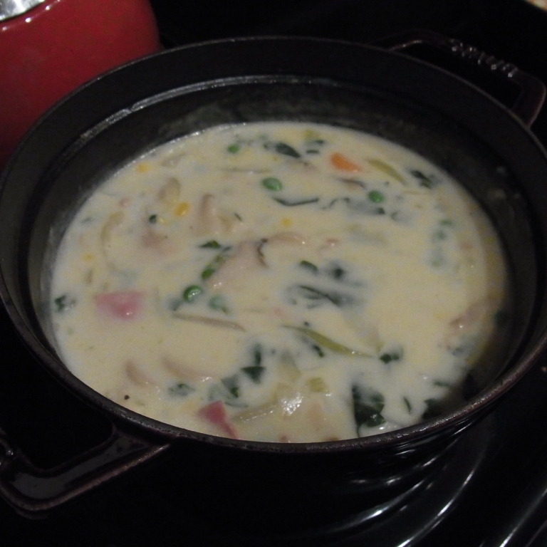 お野菜がいっぱい取れるし、なんとなく、クリームシチューって、寒い日に食べるイメージがある(日本のCMの影響ですね・・・)ので、昨夜の夕飯にはぴったりでした~。