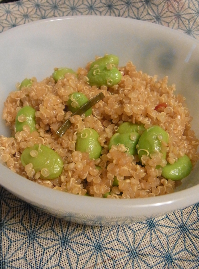 キノア 1カップ、枝豆(豆のみ)180g、昆布 3cm角程度、炒りゴマ 大さじ1、A{ゴマ油 大さじ2、ニンニクのみじん切り 小さじ1/4、生姜のみじん切り 小さじ1/2、鷹の爪の輪切り 一つまみ}、米酢 大さじ2、醤油 大さじ2