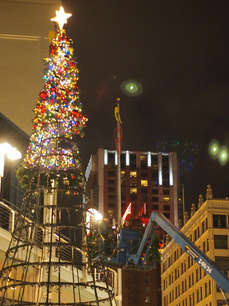 写真は、感謝祭前日に、ダウンタウンへ行った時のもの。もうクリスマスツリーの設置が始まっていました。もう、できたかな。