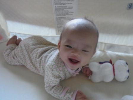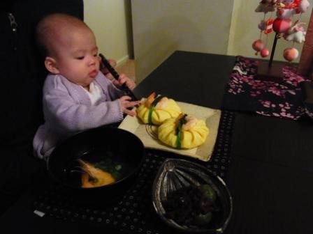 娘と一緒に写真を撮っていたら、突然、むんずとお皿をつかんで、引き寄せようとしたので、Edが面白がって、箸を持たせてみたら、ガッチリ握って、茶巾寿司に果敢に挑んでいました(笑)