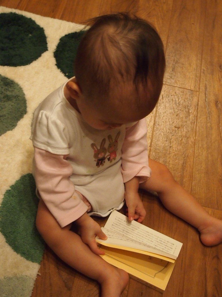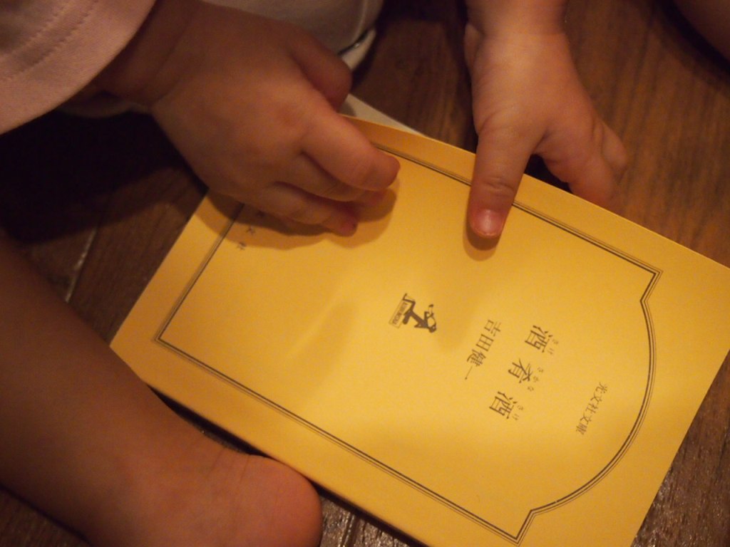 最近、私が家事をしていると、近くに座りこんで、本をめくっていることがあります。(読むのではなく、めくるだけ。本をめくる感覚が楽しいようです)自分の本をめくっていることもありますが、時々、本棚から、私の文庫本を取りだしてきます。文庫本は小さくて持ちやすいし、紙の感触が面白いんでしょうね。