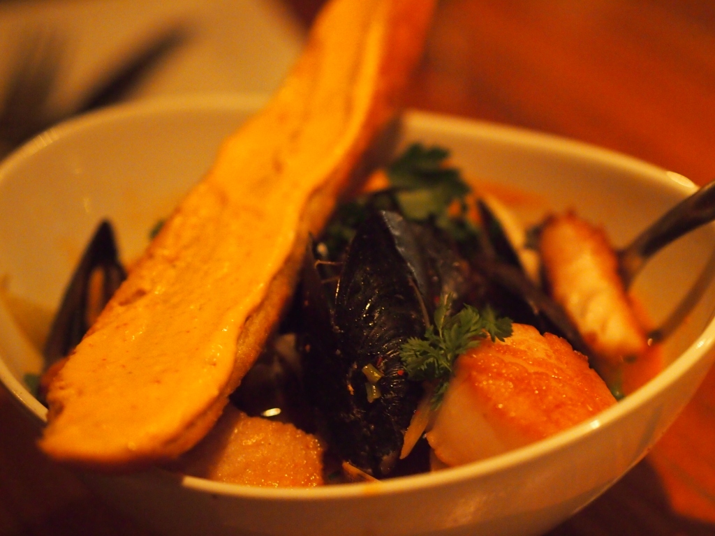 凄く濃厚な魚介のシチュー。ムール貝、サーモン、タラ、スキャロップ、などなど、魚介がてんこ盛り。