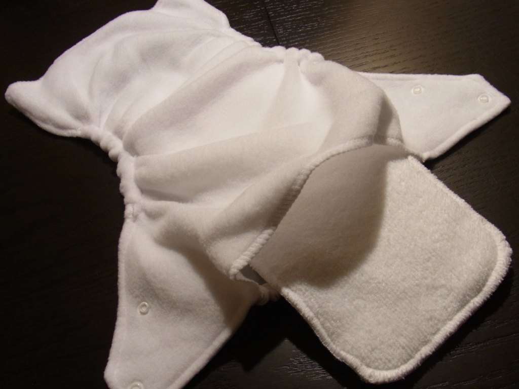 前回ご紹介したのとは別に、もう一つ、一体型と括ることができる種類があります。これは、紙おむつを布で作ってみた、という感じでしょうか。できるだけ手間を省きたい、というアメリカっぽい発想だなぁって思いました。