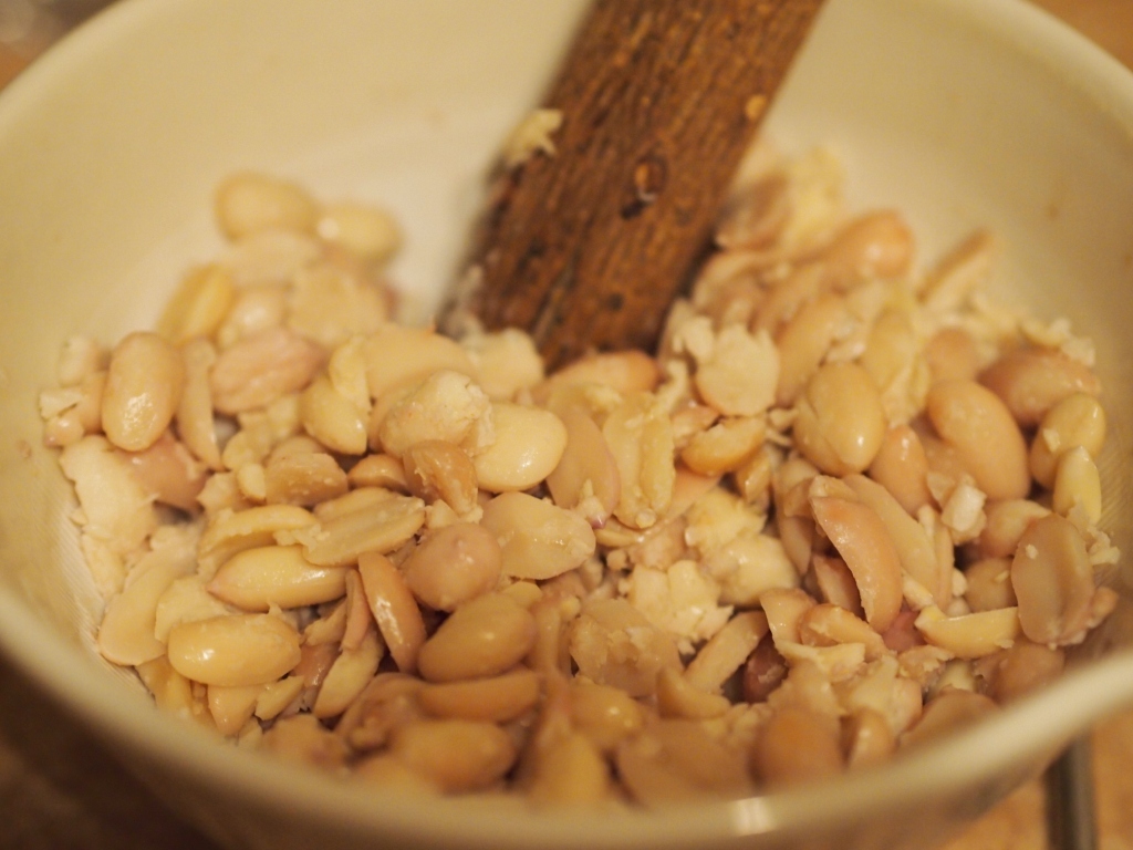 ③次は、すり鉢で潰します!フードプロセッサーがあれば、もっと楽だろうけど、すり鉢で潰すのも、味があって好きです。でも、大豆よりははるかにラクで、すぐ潰れました。