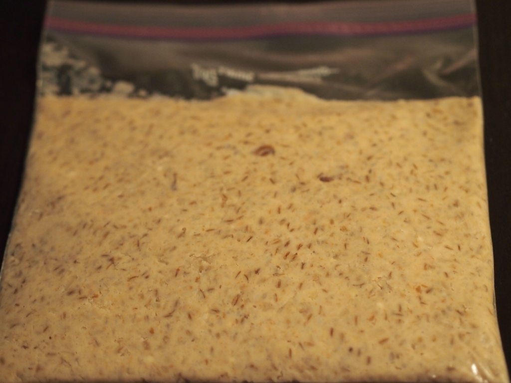 これから、常温において発酵させます。発酵によって、バッグが膨らんだり、液体がでてきたりするので、さらにもう一つのジップロックバッグに入れるつもりです。液体がでてきたら、1週間に1回は、全体に廻るようにするようです。