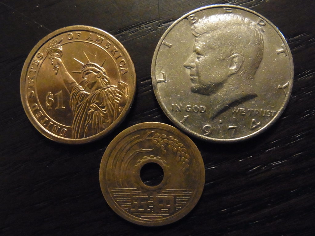 左から時計回りに、あんまり見ない$1コイン、私とEdが産まれた年の50¢コイン(これ以外、今まで見たことがありません)、それから、お金にご縁がありますようにと、日本の5円(お賽銭じゃないけど・・・)