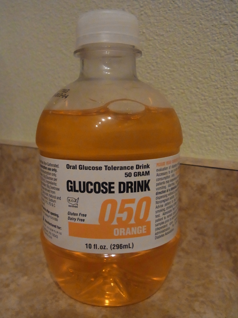 血液採取の1時間前に、上の写真の毒々しいオレンジ色のブドウ糖ドリンクを5分以内に飲まなくてはいけないのですが、殺人的に甘いのです。